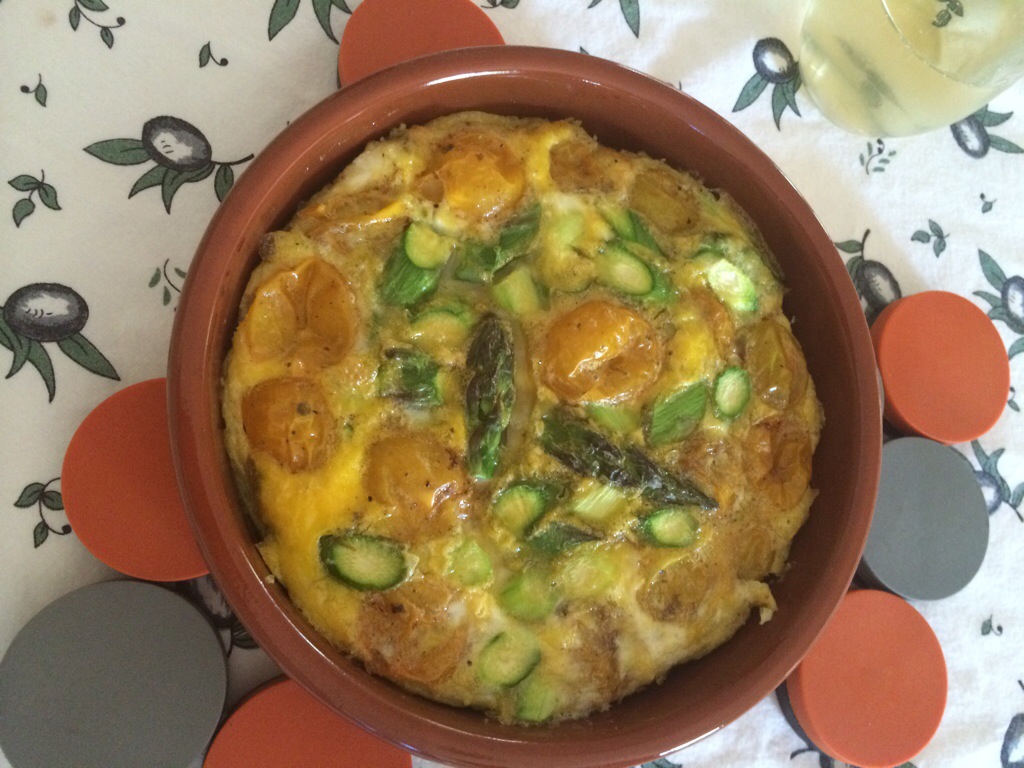 It is a delicious smoked Prosciutto, worth seeking out! La Quercia is a very good American-made brand that is top quality. I especially like it wrapped around fresh Figs, alongside a Frittata. This one pictured below was made with roasted Sungold Tomatoes, some leftover grilled Potatoes, and fresh Asparagus cut into small slices. The clay dish that I used to bake it in was quite small so it was hard to arrange the Asparagus tips in a more appealing manner, so please forgive me for lack of better styling. I often shoot photos at the spur of the moment!
