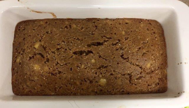 - Bake 40-50 min. Note, after 20 min. turn the pan 180 degrees. Test doneness with a toothpick. If toothpick comes out dry, it is ready. Cool 15-20 minutes before slicing (it will be hard to wait!)