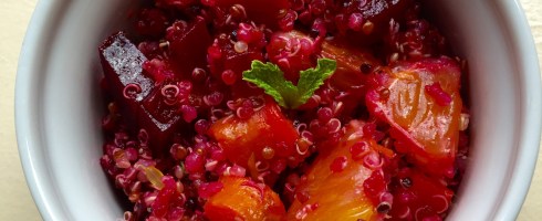 Roast Beets (approx. 1 cup) and Carrots (approx. 1 cup or 4 medium-size) in a 350 F oven, drizzled with a little Olive Oil, until tender (approx. 20-25 minutes depending on the size of the vegetables, and Carrots may be ready earlier). If Beets are large, cut in half and put cut side on baking tray, on some parchment paper for easier clean up (note, you could steam if you prefer).